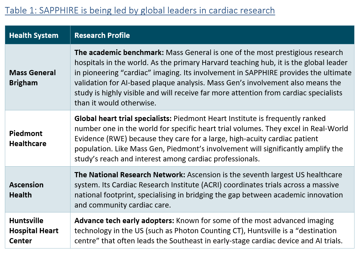 SAPPHIRE partners are not only large, but also prestigious. The study includes Mass General, one of the most prestigious hospital groups and medical research institutions in the world. Similarly, Piedmont Healthcare, Ascension and Huntsville are all regarded as leading cardiac research centres. Ascension is also the seventh-largest US healthcare system.
